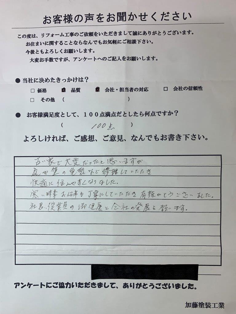 快適に住みやすくなりました。有難うございました。社長、従業員の健康と会社の発展を願います。
