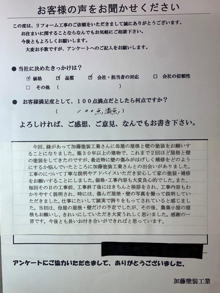 今回、縁があって加藤塗装工業さんい母屋の屋根と壁の塗装をお願いすることになりました。築30年以上の建物で、これまで2回ほど屋根と壁の塗装をしてきたのですが、最近特に壁の痛みがはげしく補修をどのようにするか悩んでいたところに加藤塗装工業さんとの出会いがありました。工事について丁寧な説明やアドバイスいただき安心して家の塗装・補修をお願いすることにしました。価格・工事内容も大変良心的でした。また、毎回その日の工事前、工事終了後にはきちんと挨拶をされ、工事内容もわかりやすく説明され、時には、痛んだ屋根・壁の写真を撮って説明していただきました。仕事にたいして誠実で誇りをもってされていると感じました。当初は、母屋の屋根・壁だけの予定でしたが、その後、農業小屋の屋根もお願いし、きれいにしていただき大変うれしく思いました。感謝の一言です。今後とも長いお付き合いができればと思っています。
