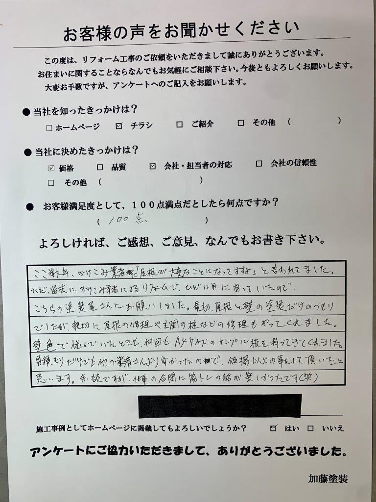 ここ数年かけこみ業者に『屋根が大変なことになってますよ』と言われてました。ただ過去にかけこみ業者によるリフォームでひどい目にあっていたので、こちらの塗装屋さんにおねがいしました。最初、屋根と壁の塗装だけのつもりでしたが、親切に屋根の修理や玄関の柱などの修理もやってくれました。