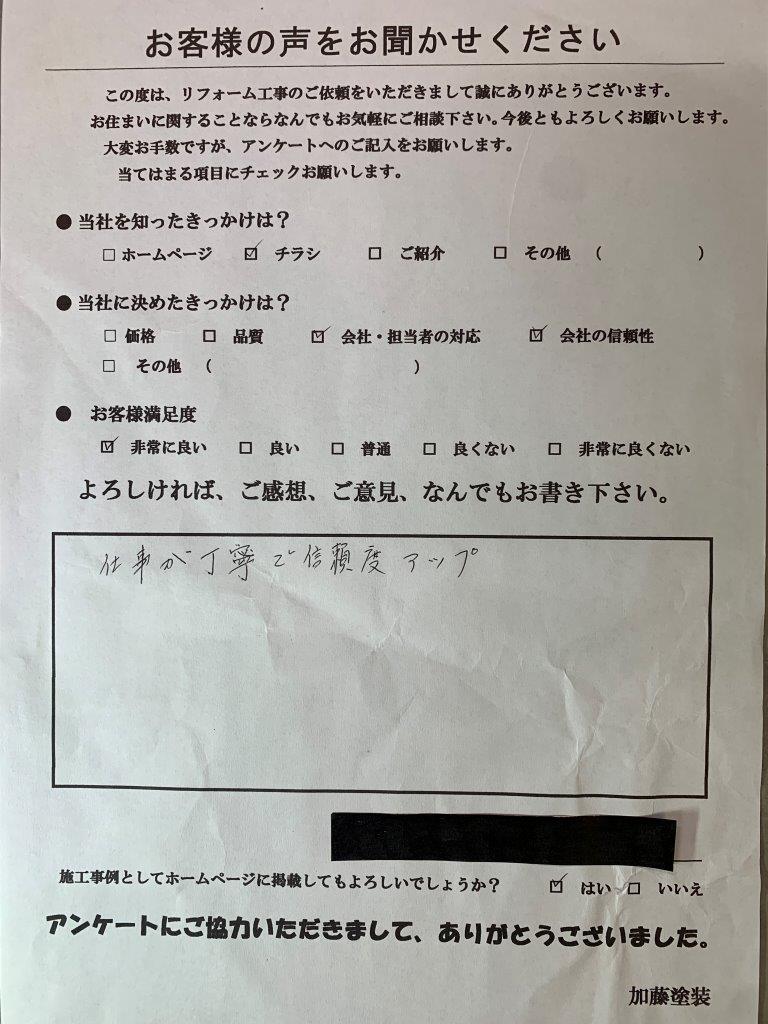 熊本市北区 N様のお声 仕事がていねいで信頼度アップ 当社に決めたきっかけは? 会社・担当者の対応/会社の信頼性 ご意見、ご感想、なんでもお書きください。 仕事がていねいで信頼度アップ 0120-659-976 [受付]8:00~20:00 [定休]元日のみ メールでお問い合わせ 前の記事 次の記事 一覧へ戻る