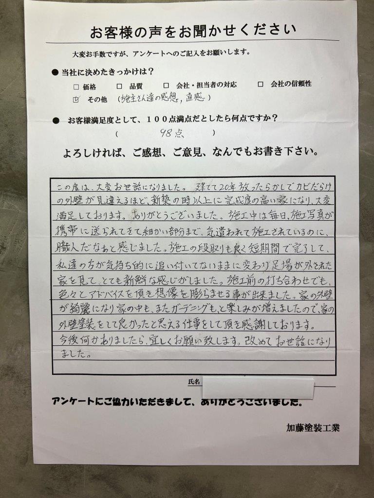 この度は、大変お世話になりました。建てて20年放ったらかしでカビだらけ の外壁が見違えるほど、新築の時以上に完成度の高い家になり、大変 満足しております。ありがとうございました。施工中は毎日、施工写真が 携帯に送られてきて細かい部分まで、気遣われて施工されているのに職人だなぁと感じました。施工の段取りも良く短期間で完了して、 私達の方が気持ち的に追い付いてないままに変わり足場が外された 家を見てとても新鮮な感じがしました。施工前の打ち合わせでも色々とアドバイスを頂き想像を膨らませる事が出来ました。家の外壁 が綺麗になり家の中も、またガーデニングもっと楽しみが増えましたので、家の 外壁塗装をして良かったと思える仕事をして頂き感謝しております。 今後何かありましたら、宜しくお願い致します。改めてお世話になり ました。