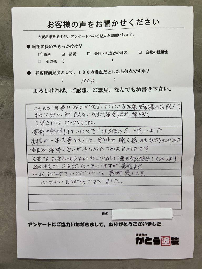 このたび無事に施工が完了しましたのも加藤塗装様のお陰です。 本当に細かい所、見えない所まで、筆塗りされ線を引く丁寧さにはビックリでした。 塗料の説明もしていただき「なるほど!」と思いました。 屋根が一番大事と言うこと、塗料や、職人様の大切さも知りました。 期間中、塗料の匂いが少なかったことは、良かったです 立派なお重みのある家に仕上り安心して暮せる家満足しております。 追加注文で、大変だったと思いますが、最後まで、 心よく仕上げていただいたこと、感謝致します。 心づかいありがとうございました。