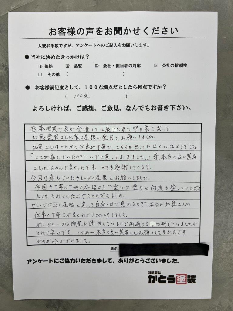 熊本地震で家が全壊して山鹿に来て、空き家を買って かとう塗装さんに家の屋根の塗装をお願いしました。 加藤さんはとにかく仕事が丁寧で、こちらが思ってた以上の仕上りでした。「ここが痛んでいたのでついでに直しておきました。」等、本当に良い業者 加藤さんにたのんで良かったです。とても感謝しています。 今回は痛んでいたガレージの屋根をお願いしました。 今回も丁寧に下地の処理から下塗り上塗りと何度も塗っていただき とてもきれいに仕上げていただきました。 ガレージは家の屋根と違って自分の目で見れるので、本当に加藤さんの仕事の丁寧さが良くわかりびっくりしました。 ガレージの一つは物置に使用しているので両通りを、心配していましたがこれで安心です。いやぁー本当に良い業者さんお願いして良かったです。 ありがとうございました。