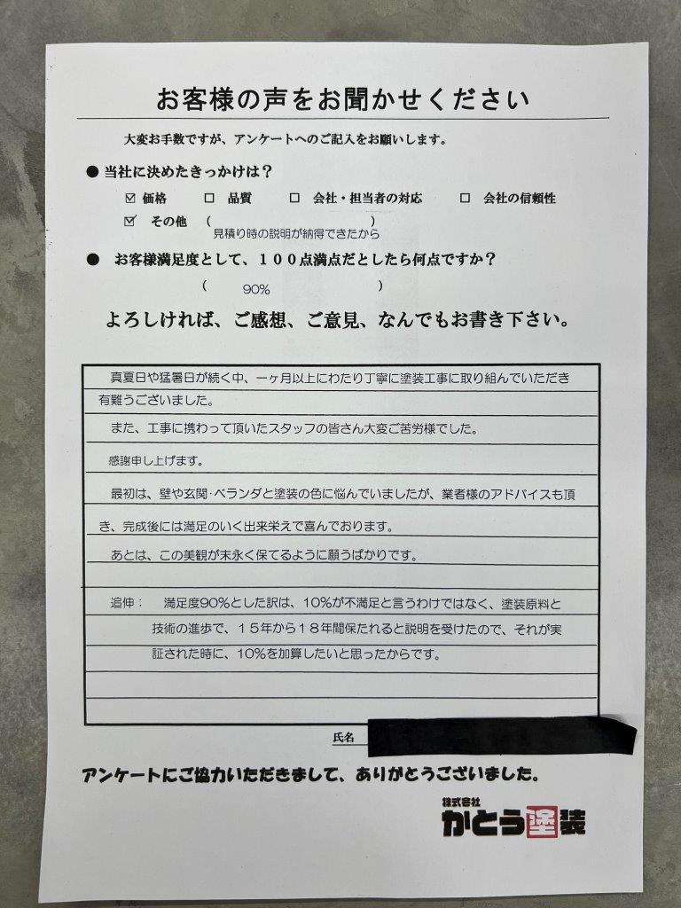 真夏日や猛暑日が続く中、一ヶ月以上にわたり丁寧に塗装工事に取り組んでいただき 有難うございました。 また、工事に携わって頂いたスタッフの皆さん大変ご苦労様でした。 感謝申し上げます。 最初は、壁や玄関・ベランダと塗装の色に悩んでいましたが、 業者様のアドバイスも頂 き、完成後には満足のいく出来栄えで喜んでおります。 あとは、この美観が末永く保てるように願うばかりです。 追伸: 満足度90%とした訳は、 10%が不満足と言うわけではなく、 塗装原料と 技術の進歩で、15年から18年間保たれると説明を受けたので、それが実 証された時に、 10%を加算したいと思ったからです。
