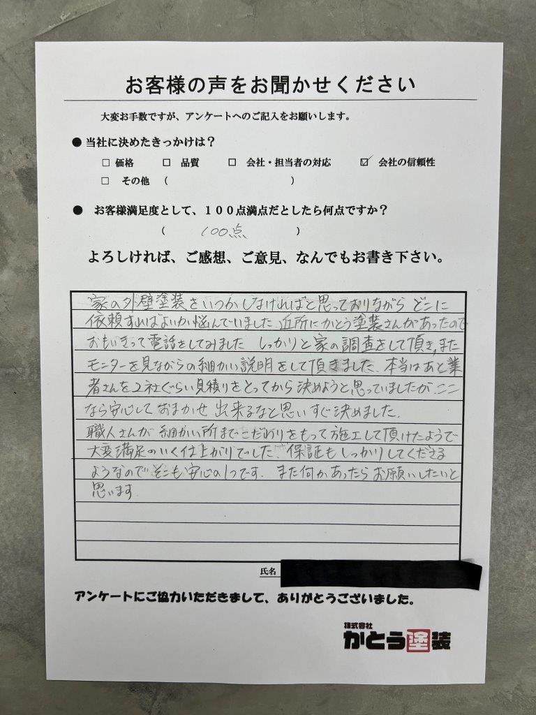 家の外壁塗装をいつかしなければと思っておりながらどこに 依頼すればよいか悩んでいました。近所にかとう塗装さんがあったので おもいきって電話をしてみましたしっかりと家の調査をして頂き、また モニターを見ながらの細かい説明をして頂きました。本当はあと業 者さんを2社ぐらい見積りをとってから決めようと思っていましたが、ここ なら安心しておまかせ出来るなと思いすぐ決めました。 職人さんが細かい所までこだわりをもって施工して頂けたようで 大変満足のいく仕上がりでした、保証もしっかりしてくださる ようなのでそこも安心の1つです。また何かあったらお願いしたいと 思います。