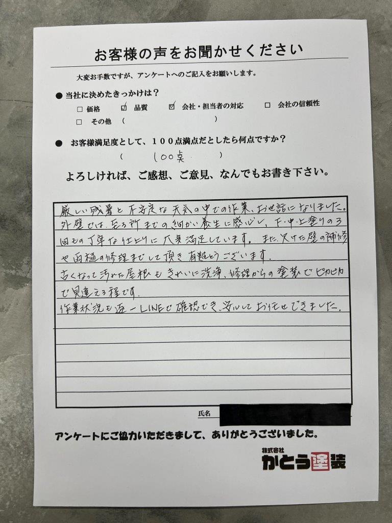 厳しい残暑と不安定な天気の中での作業、お世話になりました。 外壁では至る所までの細かい養生に感心し、下・中・上塗りの3回もの丁寧な仕上りに大変満足しています。また、欠けた壁の補修や雨樋の修理までして頂き有難うございます。 古くなって汚れた屋根もきれいに洗浄、修理からの塗装でピカピカで見違える程です。 作業状況も逐一LINEで確認でき、安心してお任せできました。